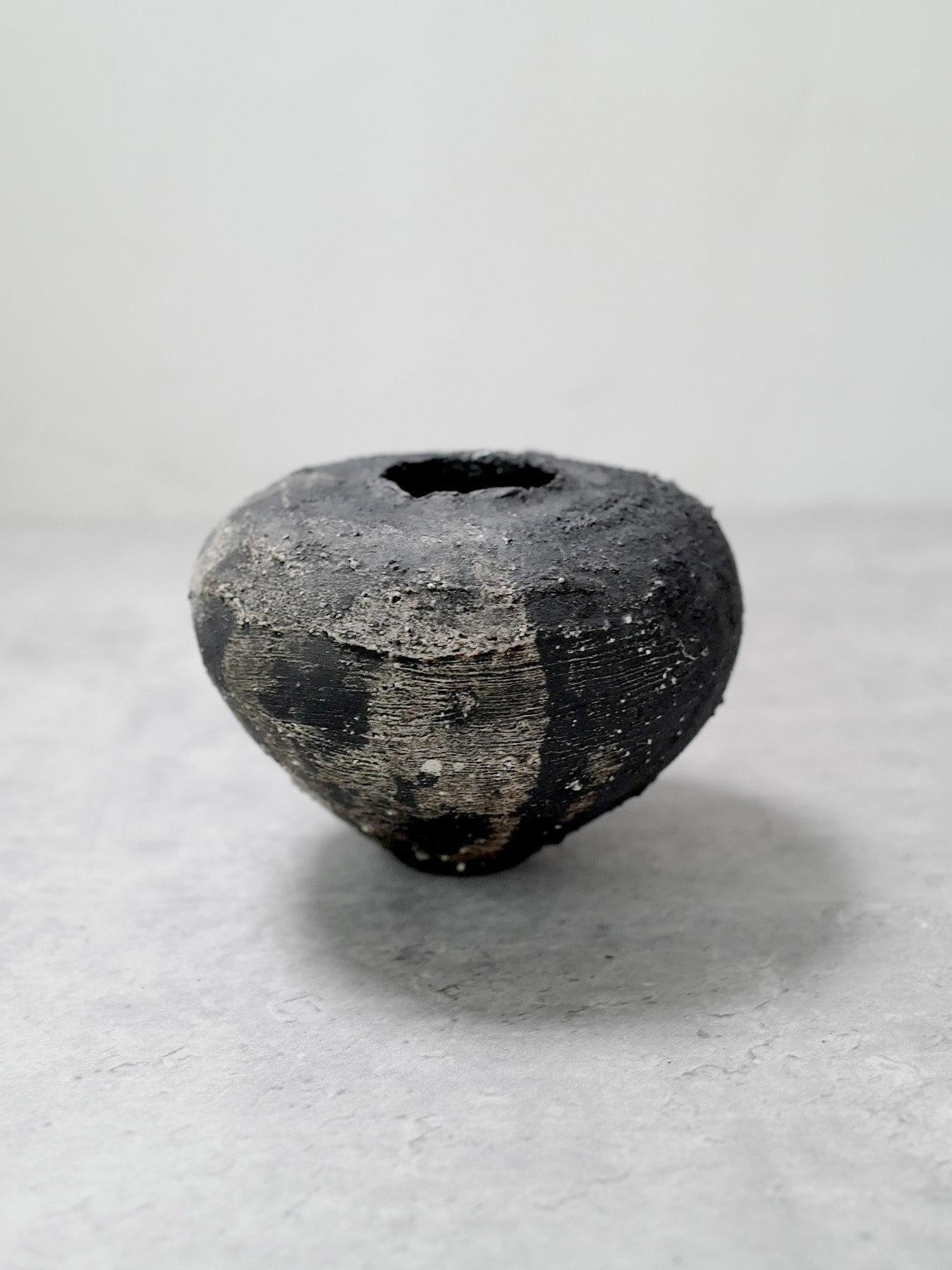 取り扱い : 経年により質感の変化や剥落、退色等が進むことがありますが、作風の一部としてご理解ください。作品は仕上げ時に顔料の退色を防ぐためのワニスで保護し、多くには撥水コーティングを施しておりますが、ひびや剥がれ等作風の特性を優先しているため、水を入れての使用は避け空間に佇むオブジェ作品としてお楽しみください。