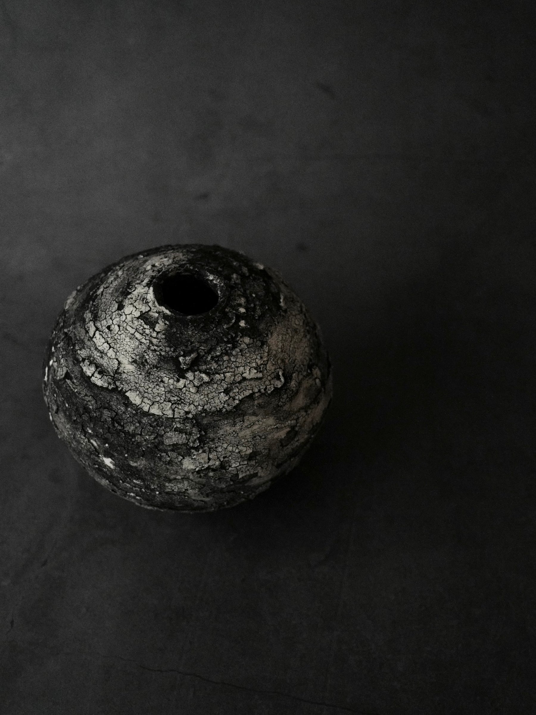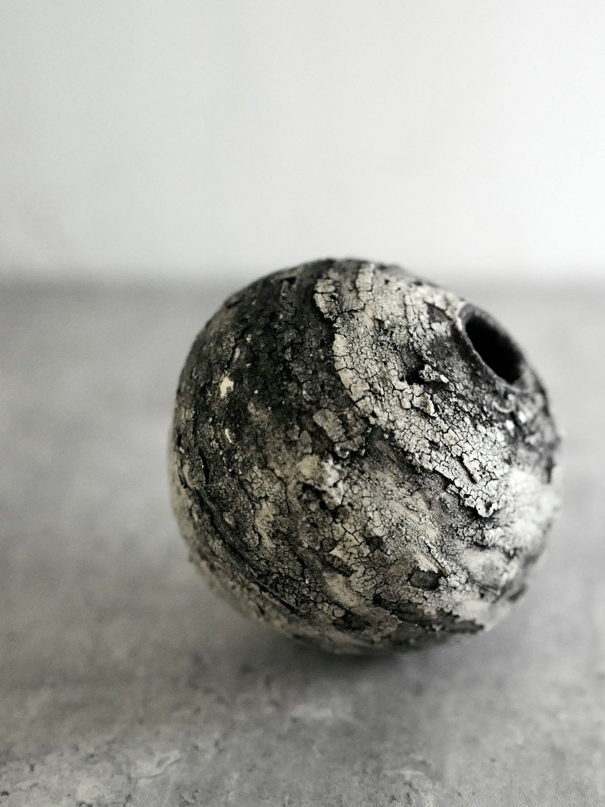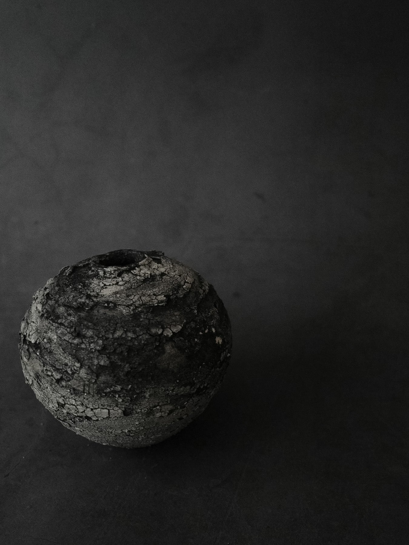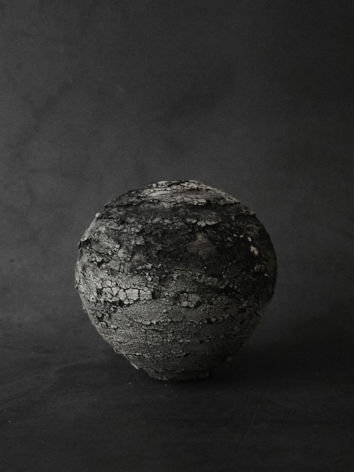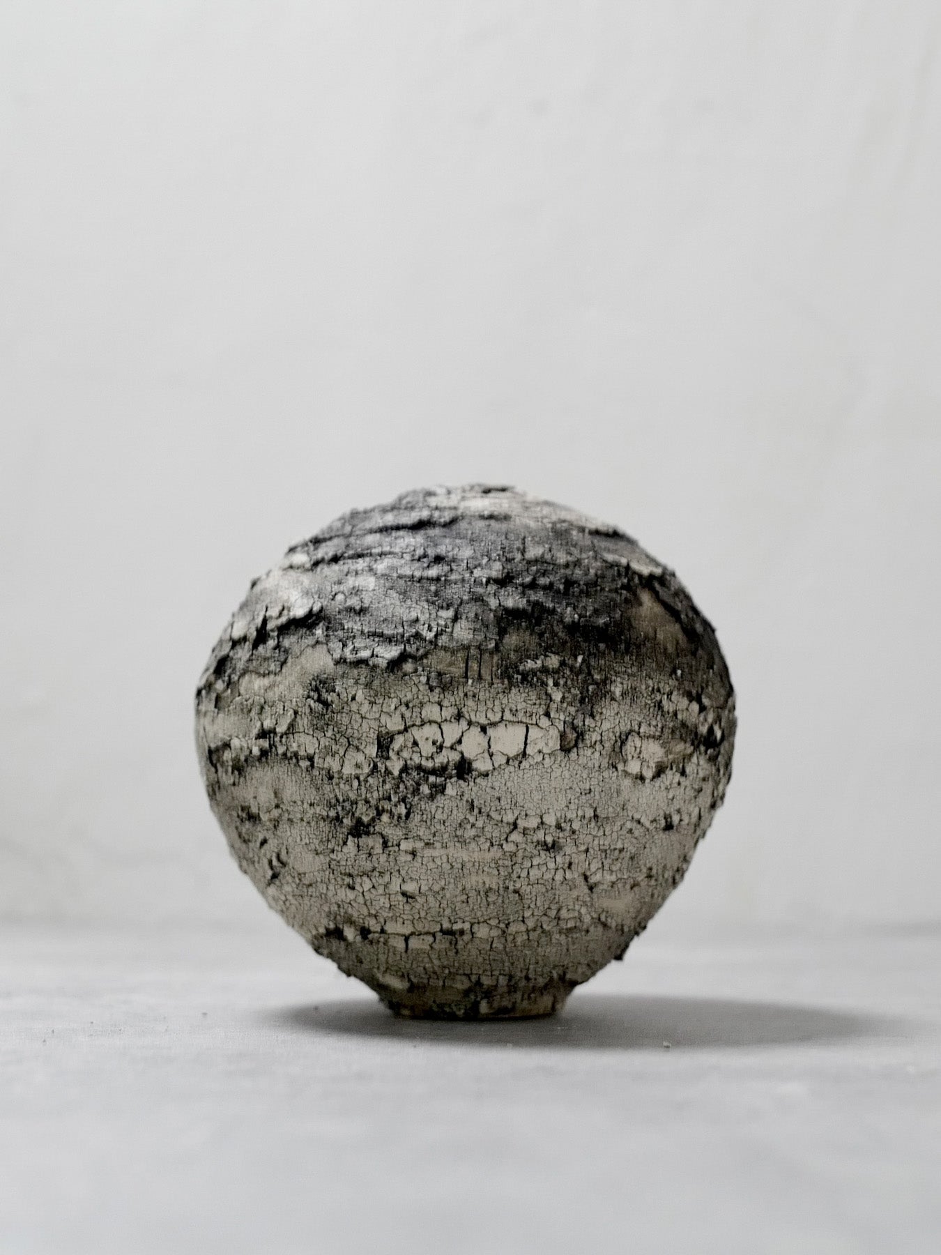 作品説明 :呼吸のようなゆらぎを持つ歪球体。剥落した素地に朧に浮かぶ光の風景が見る方の心にそっと寄り添います。