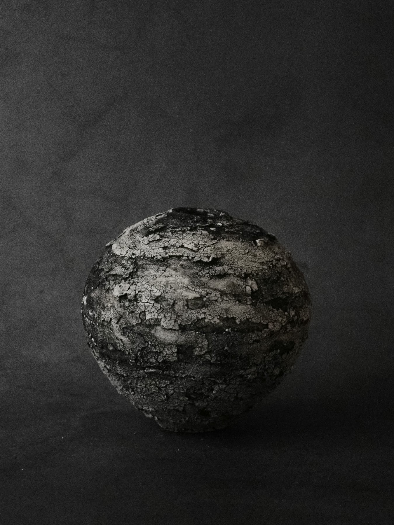 Description A distorted sphere imbued with the gentle undulation of breath. Upon its eroded surface, a faint landscape of light emerges— softly embracing the viewer’s heart.
