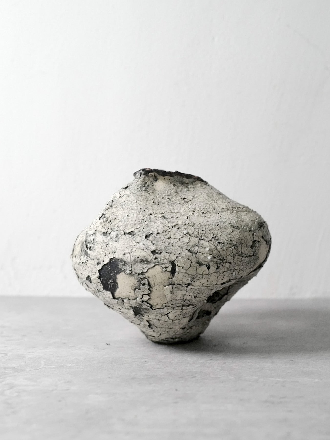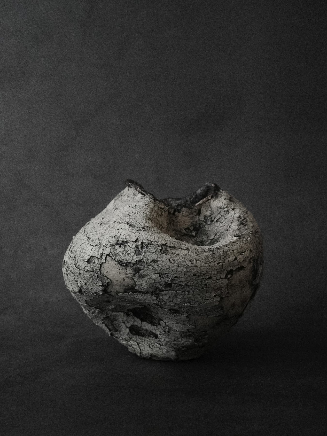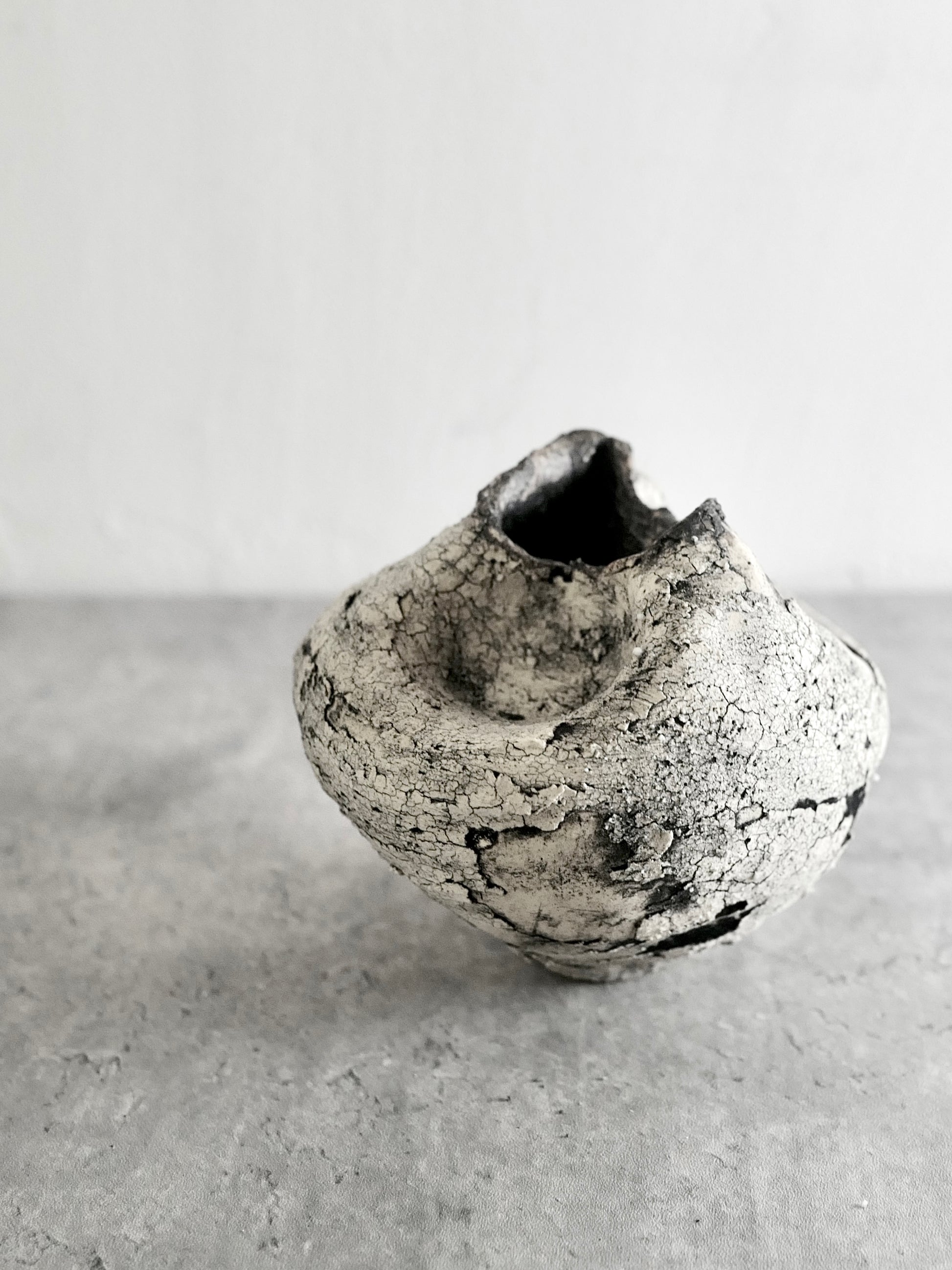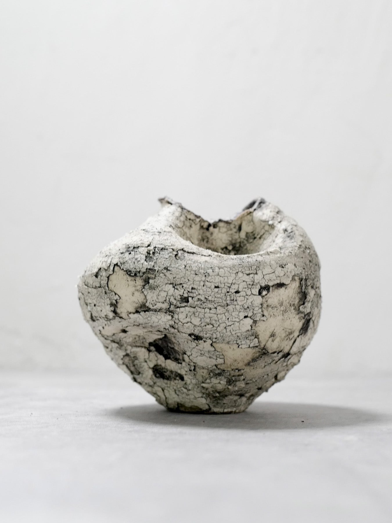 Handling & Care Over time, the piece may undergo changes in texture, peeling, or discoloration—these are integral aspects of its expression. Each work is protected with a varnish to slow pigment fading, and most are treated with a water-repellent coating. However, as the aesthetic prioritizes cracks and surface fragility, please avoid filling it with water. Enjoy it as an object of still presence within space, rather than as a functional vessel. While every effort has been made to capture the work’s true color and texture in photographs, subtle variations may appear depending on the lighting and environment in which it is viewed. For inquiries or additional photographs, please feel free to contact us.