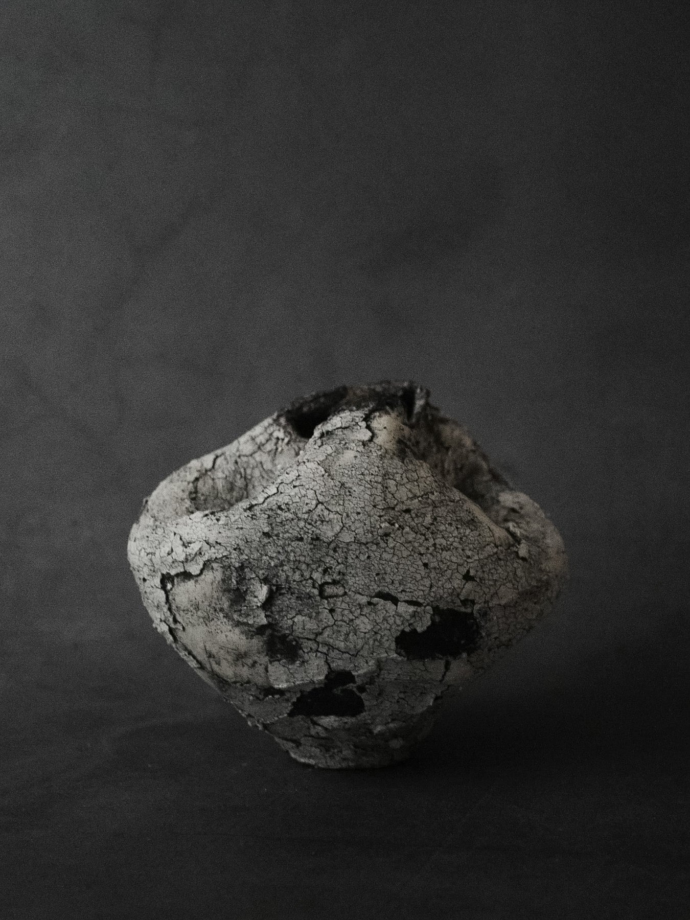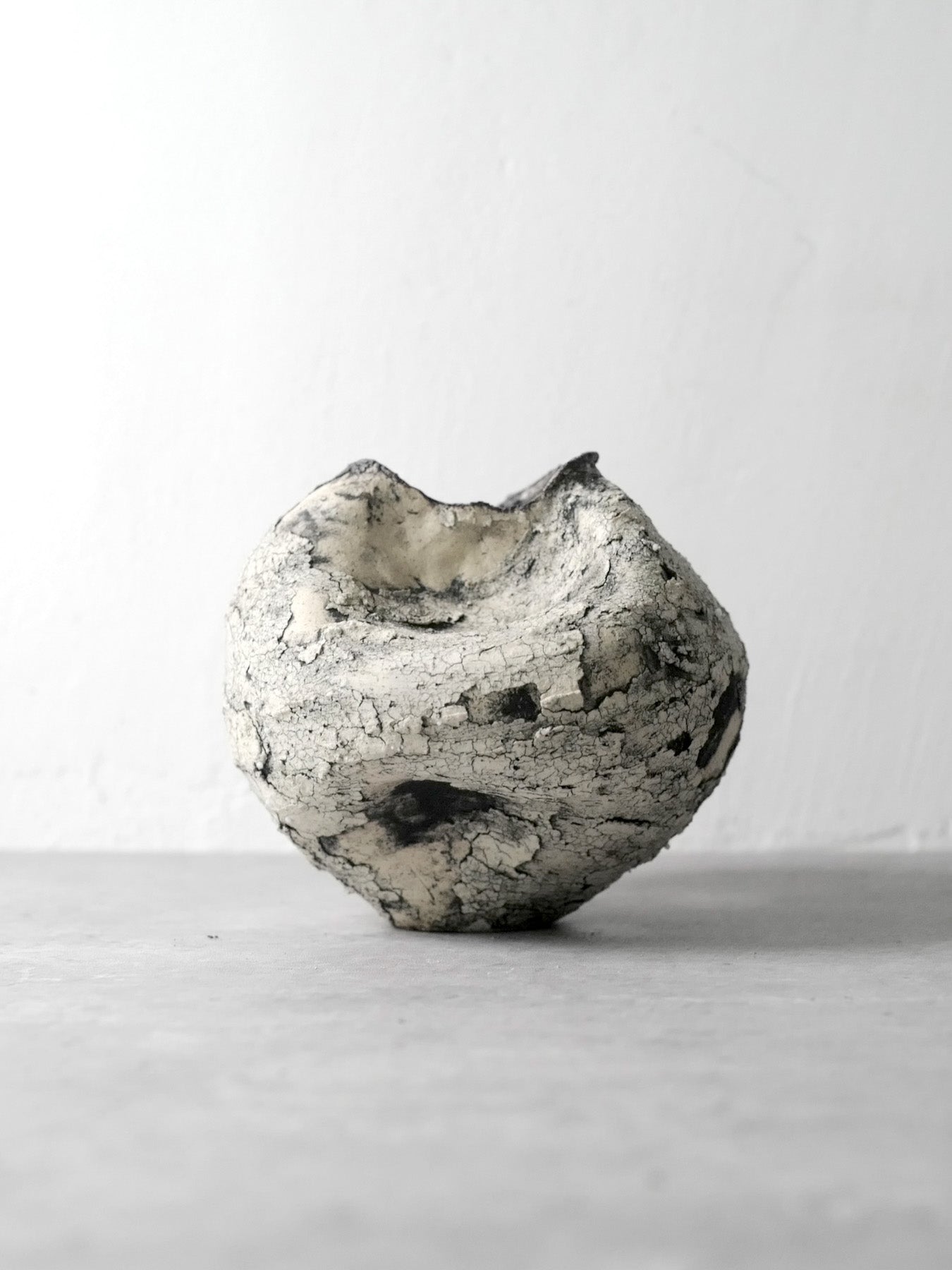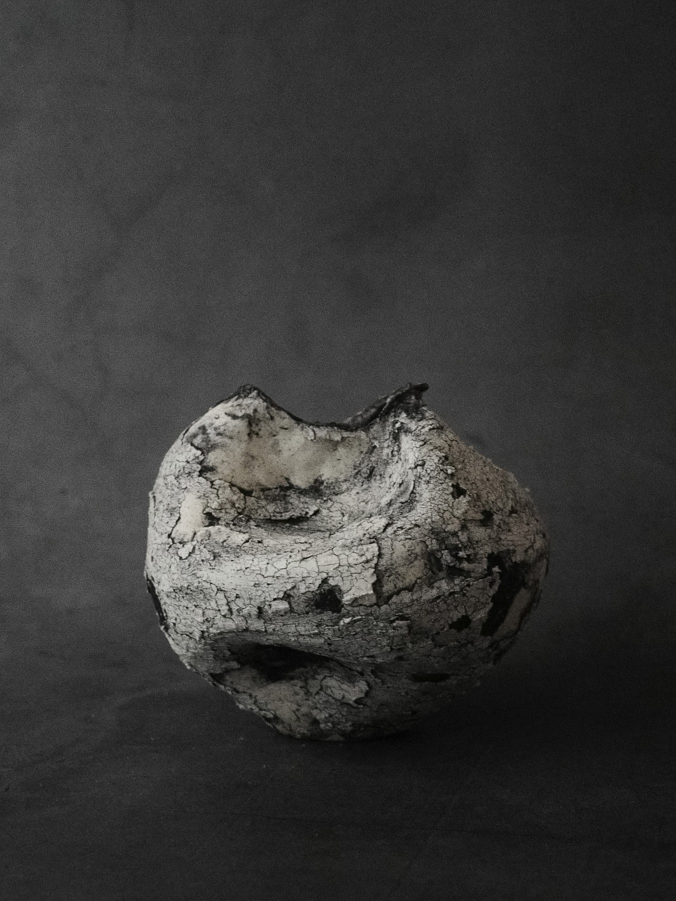 Handling & Care Over time, the piece may undergo changes in texture, peeling, or discoloration—these are integral aspects of its expression. Each work is protected with a varnish to slow pigment fading, and most are treated with a water-repellent coating. However, as the aesthetic prioritizes cracks and surface fragility, please avoid filling it with water. Enjoy it as an object of still presence within space, rather than as a functional vessel. While every effort has been made to capture the work’s true color and texture in photographs, subtle variations may appear depending on the lighting and environment in which it is viewed. For inquiries or additional photographs, please feel free to contact us.