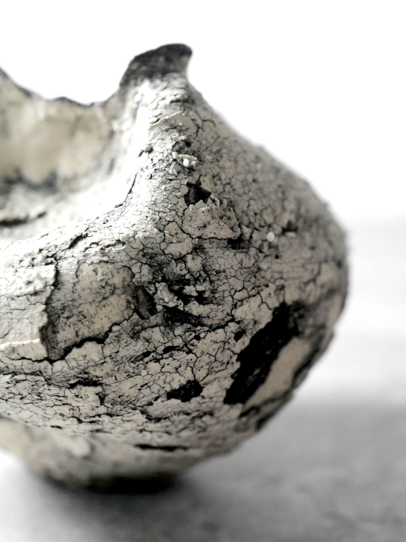 取り扱い : 経年により質感の変化や剥落、退色等が進むことがありますが、作風の一部としてご理解ください。作品は仕上げ時に顔料の退色を防ぐためのワニスで保護し、多くには撥水コーティングを施しておりますが、ひびや剥がれ等作風の特性を優先しているため、水を入れての使用は避け空間に佇むオブジェ作品としてお楽しみください。