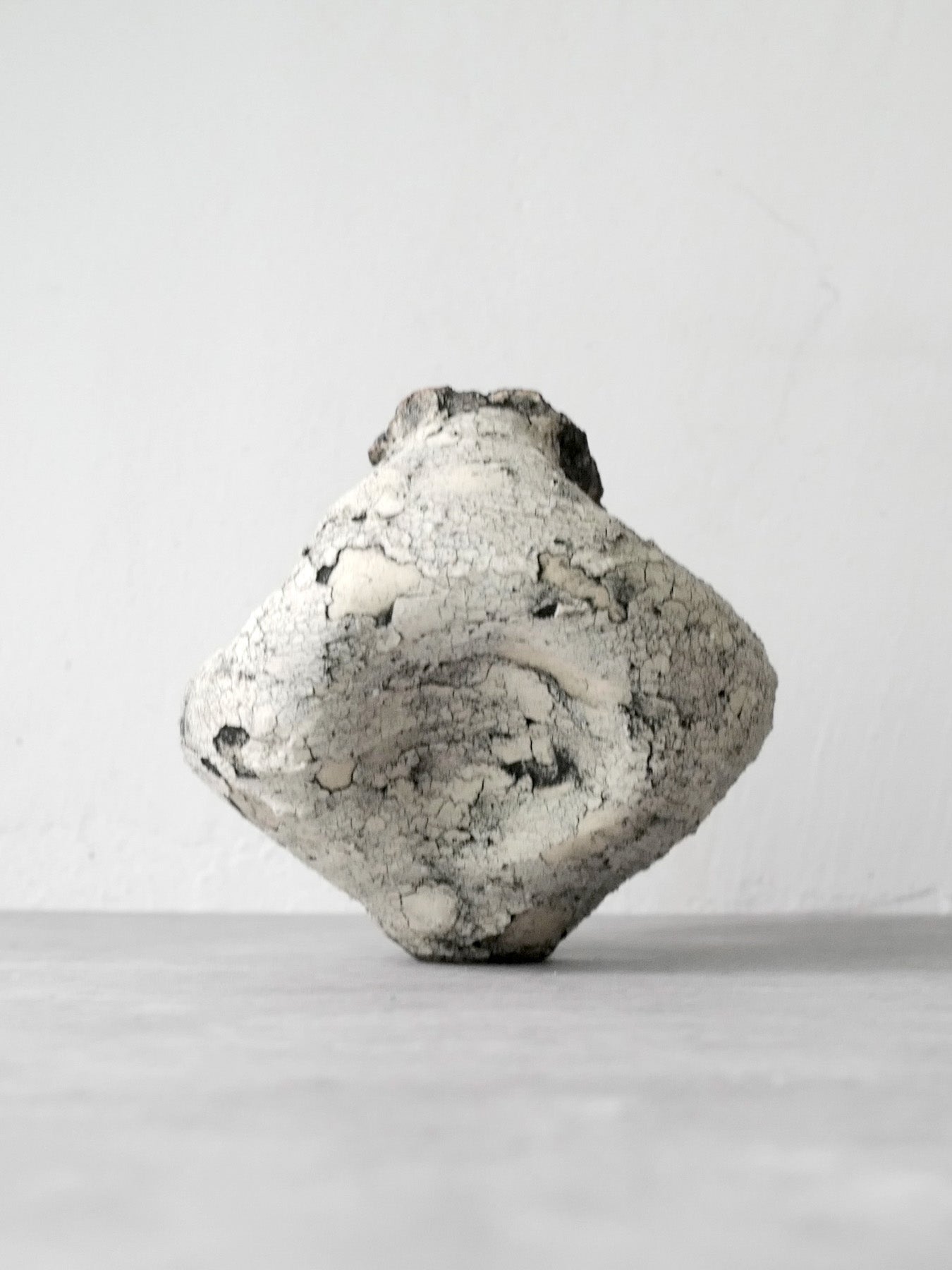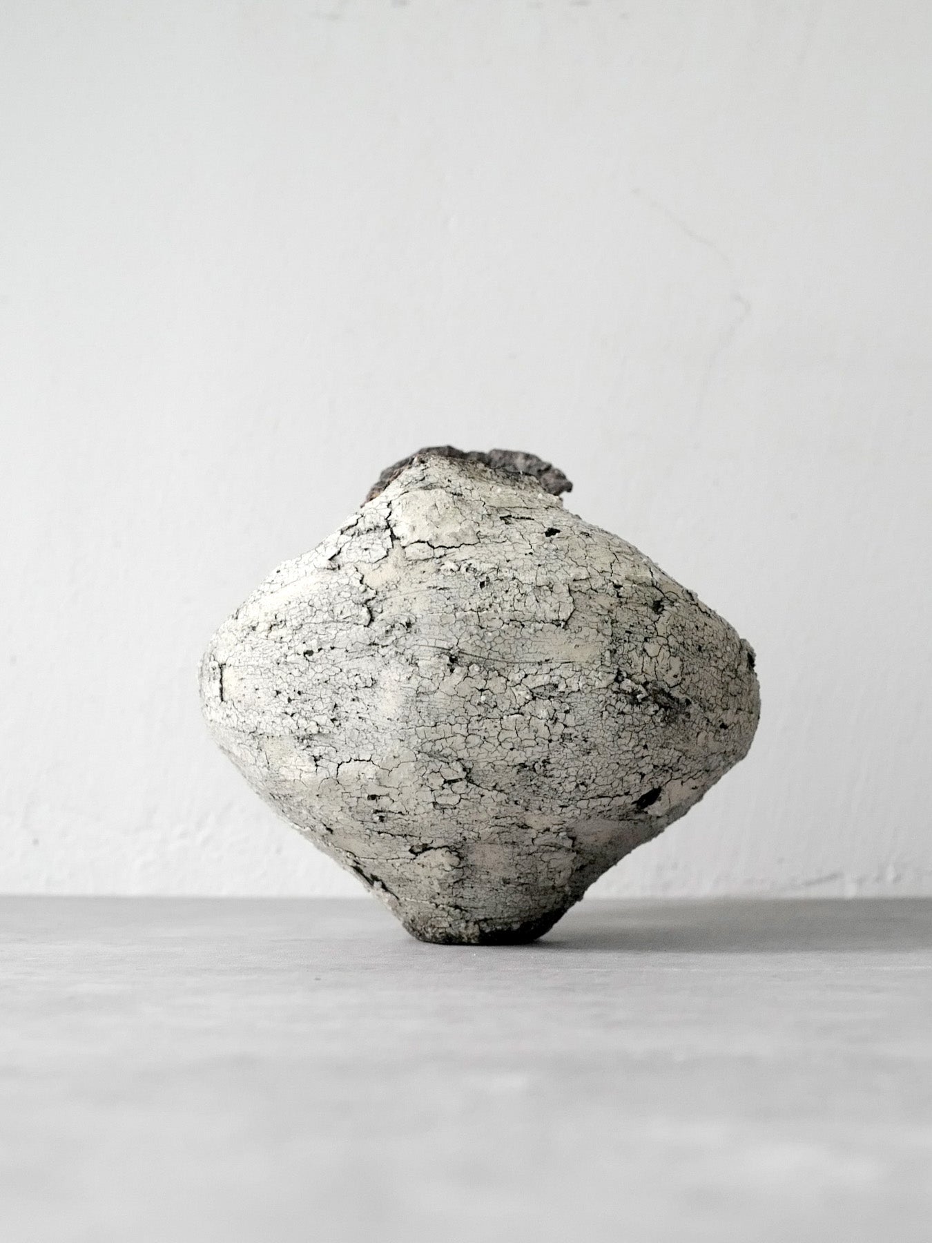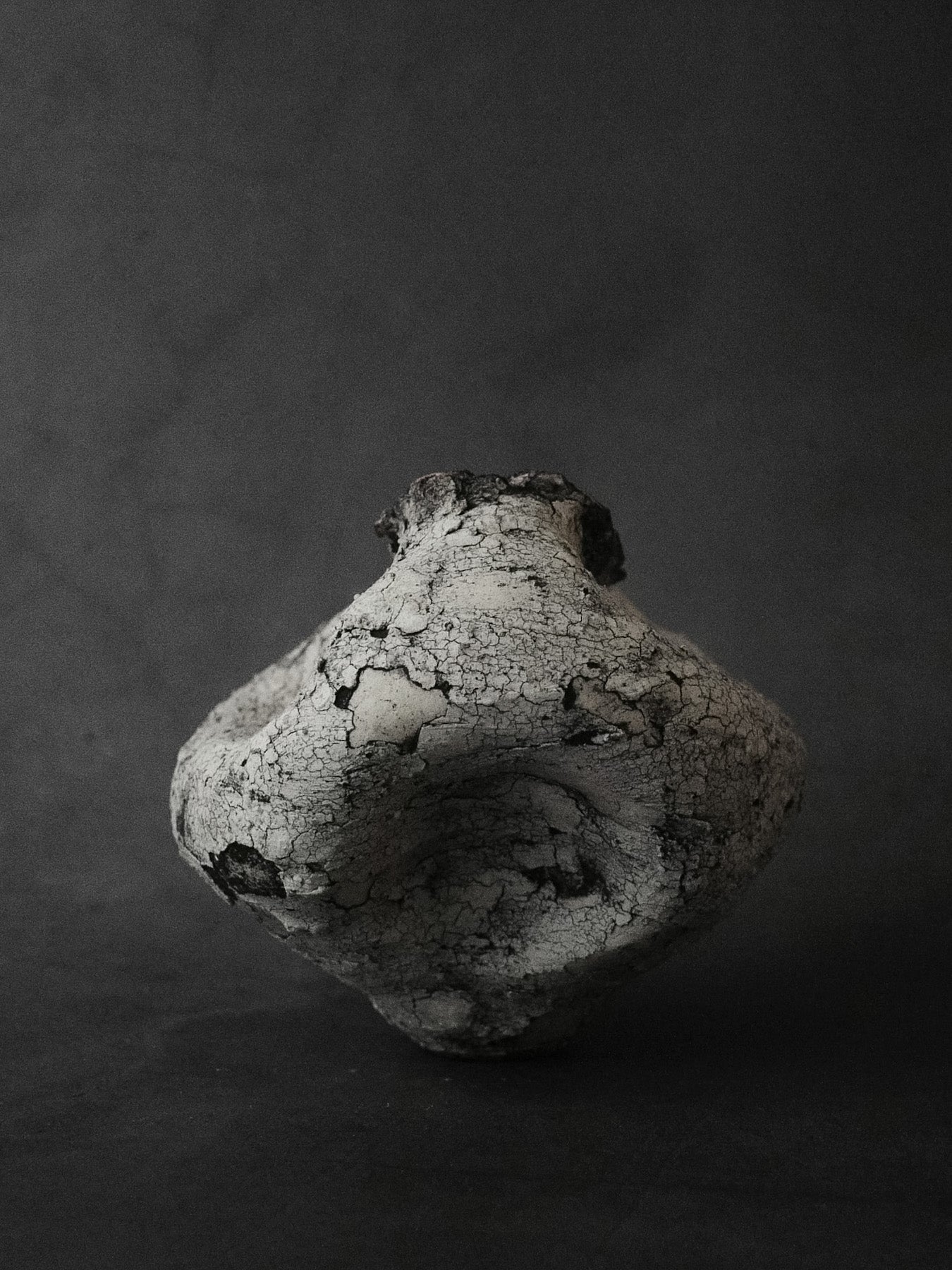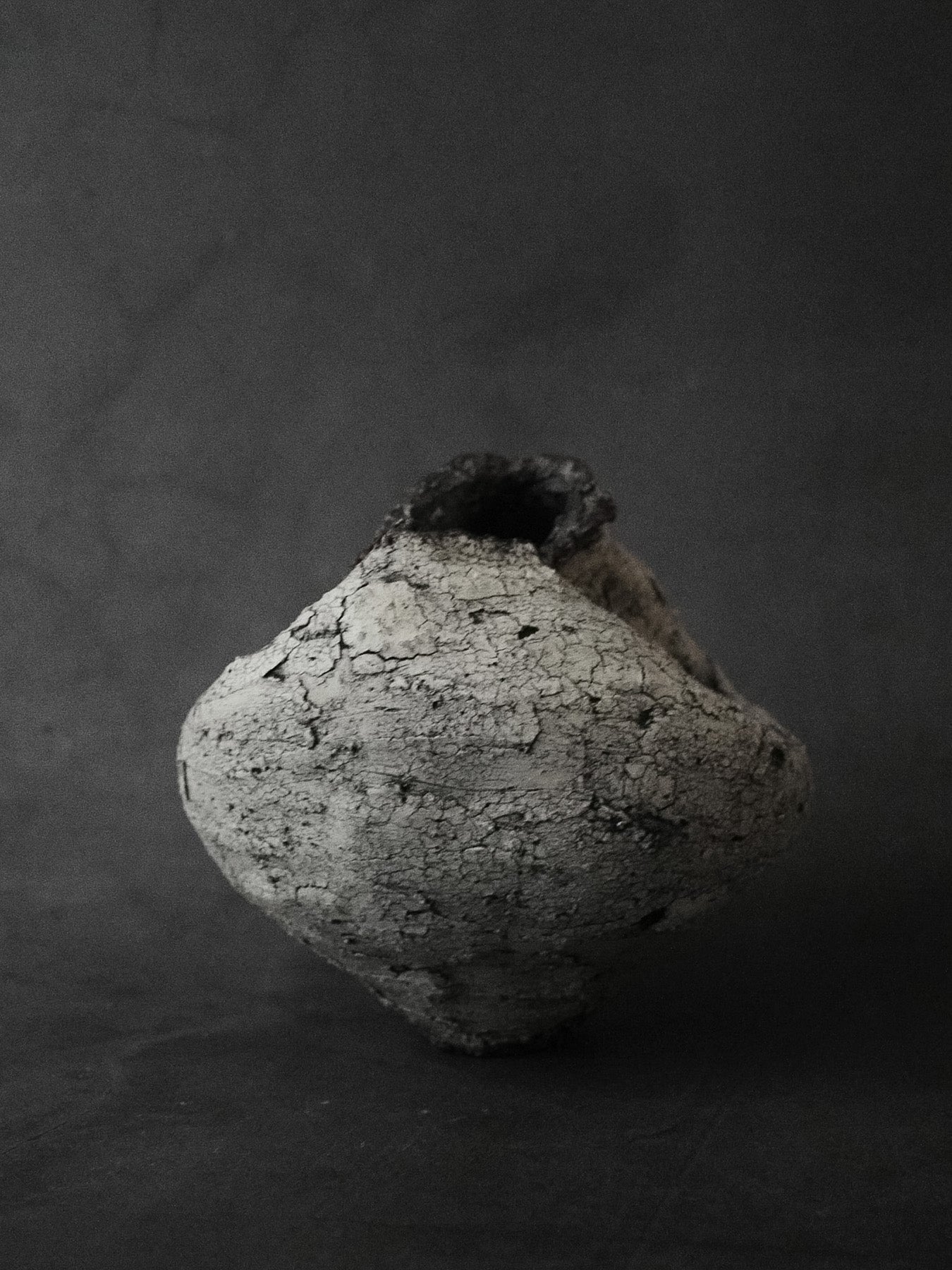Handling & Care Over time, the piece may undergo changes in texture, peeling, or discoloration—these are integral aspects of its expression. Each work is protected with a varnish to slow pigment fading, and most are treated with a water-repellent coating. However, as the aesthetic prioritizes cracks and surface fragility, please avoid filling it with water. Enjoy it as an object of still presence within space, rather than as a functional vessel. While every effort has been made to capture the work’s true color and texture in photographs, subtle variations may appear depending on the lighting and environment in which it is viewed. For inquiries or additional photographs, please feel free to contact us.