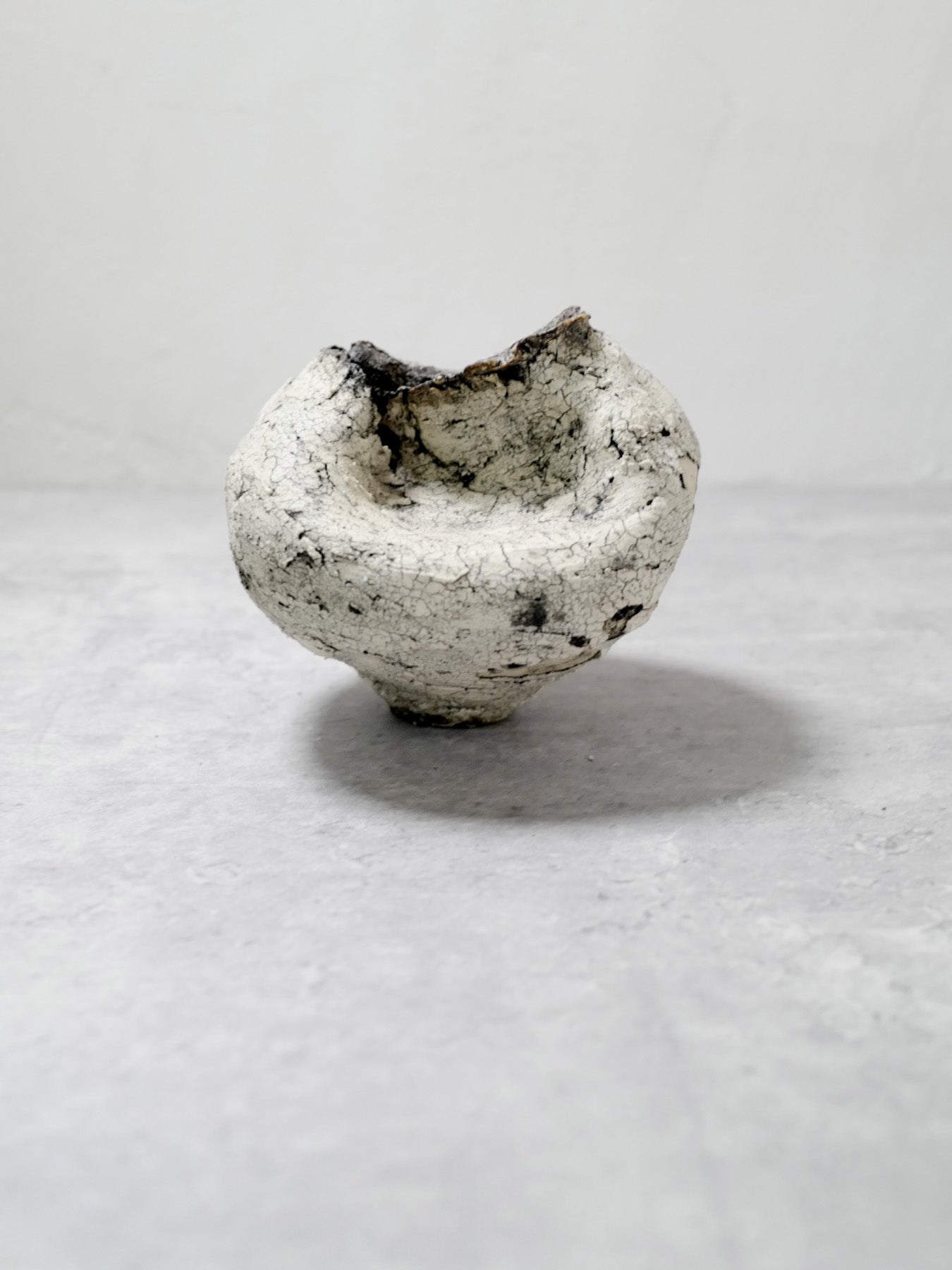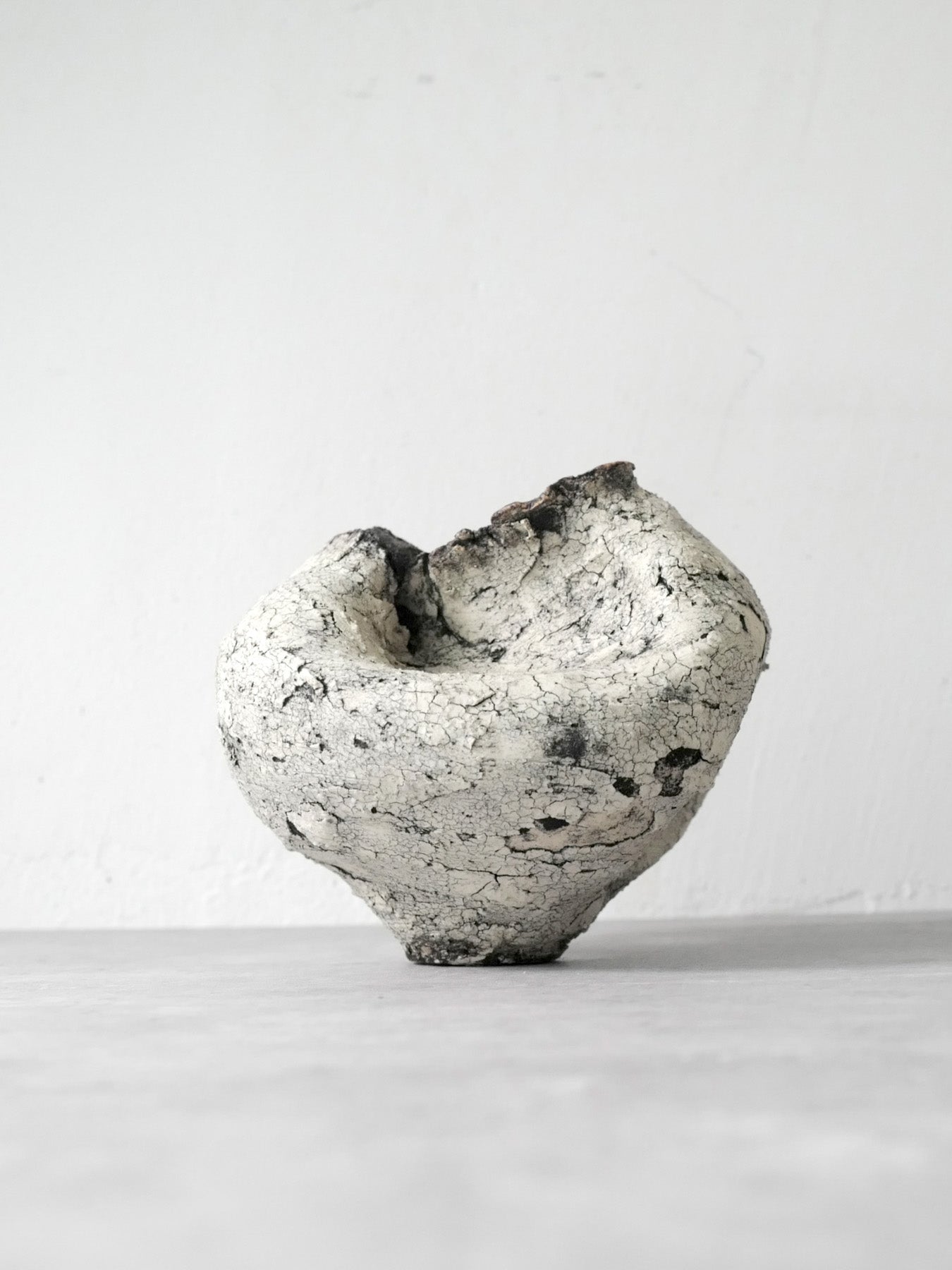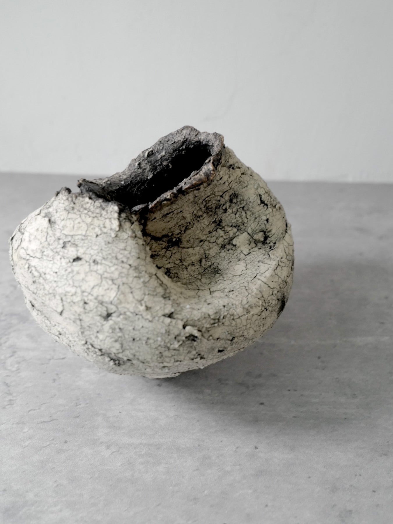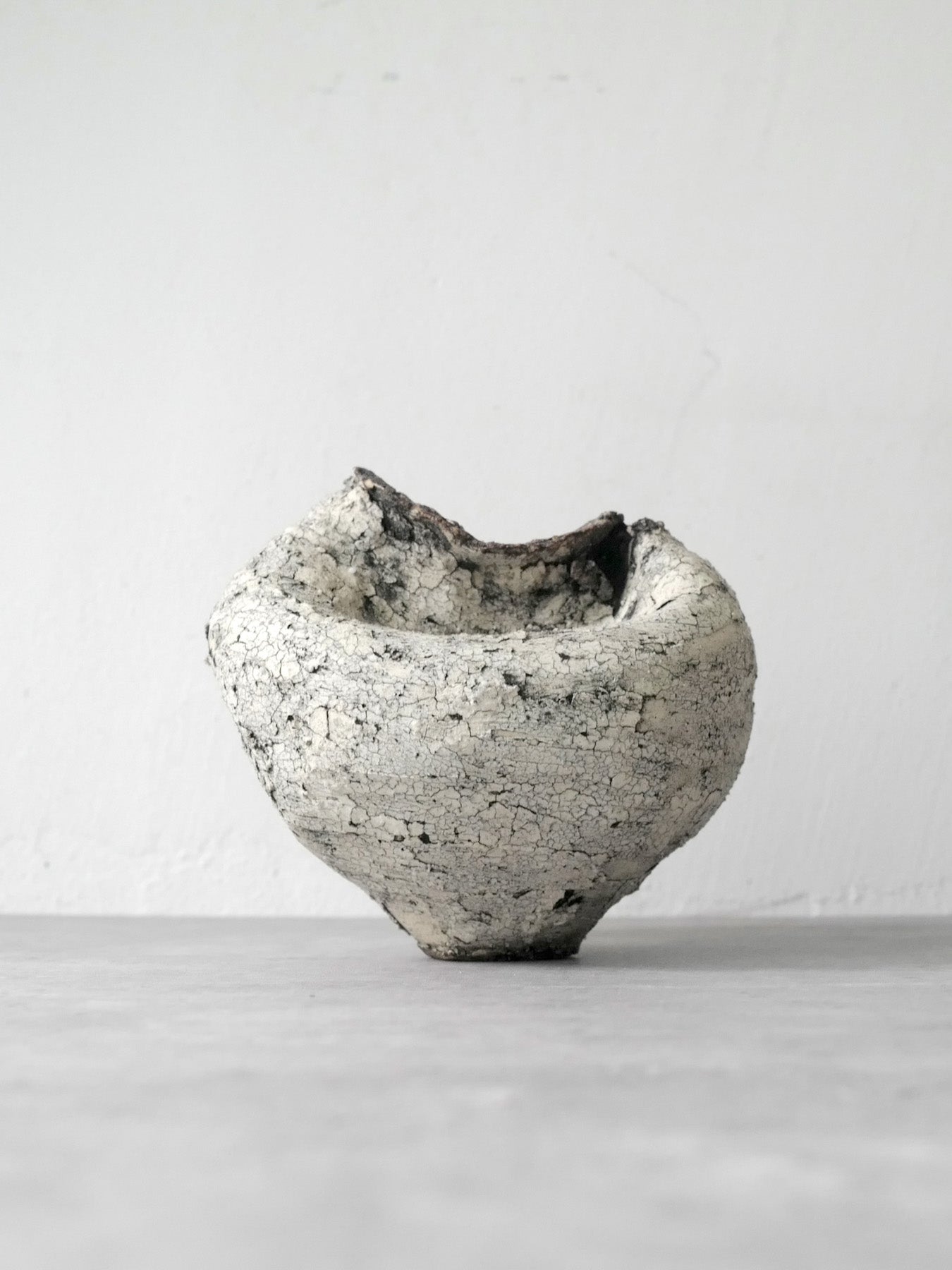 取り扱い : 経年により質感の変化や剥落、退色等が進むことがありますが、作風の一部としてご理解ください。作品は仕上げ時に顔料の退色を防ぐためのワニスで保護し、多くには撥水コーティングを施しておりますが、ひびや剥がれ等作風の特性を優先しているため、水を入れての使用は避け空間に佇むオブジェ作品としてお楽しみください。