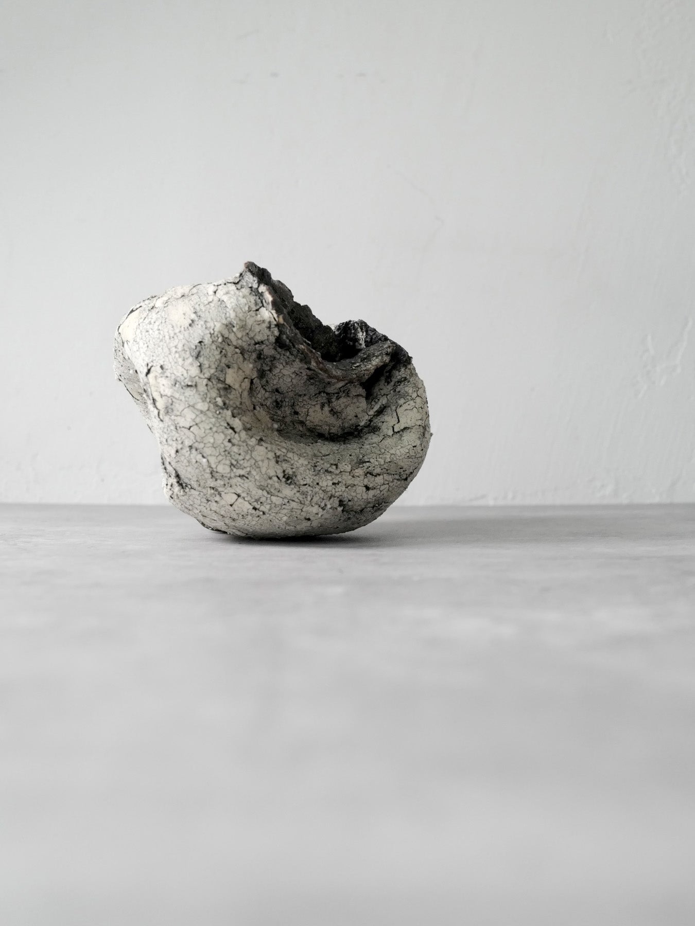 作品説明 : 蓮の葉のように湾曲させた揺らぎのあるフォルムと、黒粉によってウェザリングされたヒビの表皮が、空間に溶け込みながら呼吸のように静かに沈殿して行きます。